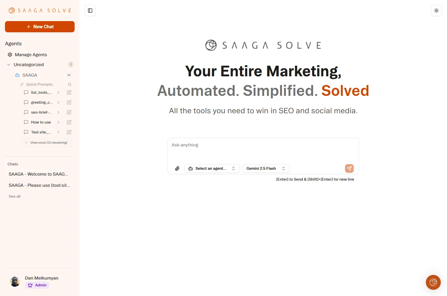 Give the tool/agent your prompt. For e.g, if you want to do keyword research for your website, give our agent the link to your website and instruct it to do keyword research for it. If possible, you may also give the agent links to your top competitors or a list of your top organic keywords to guide it better.
